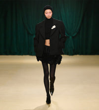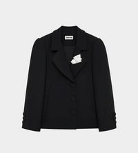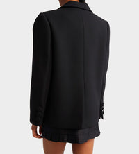 Basket-woven polyester- and wool-blend oversized suit blazer. Notched lapel. Button closure. Logo-embroidered appliqué at chest. Welt pockets. Padded shoulders. Three-button surgeon's cuff. Full satin lining