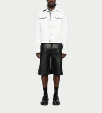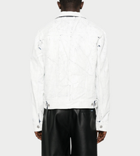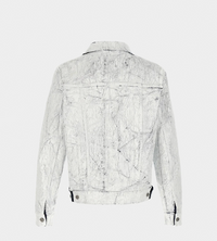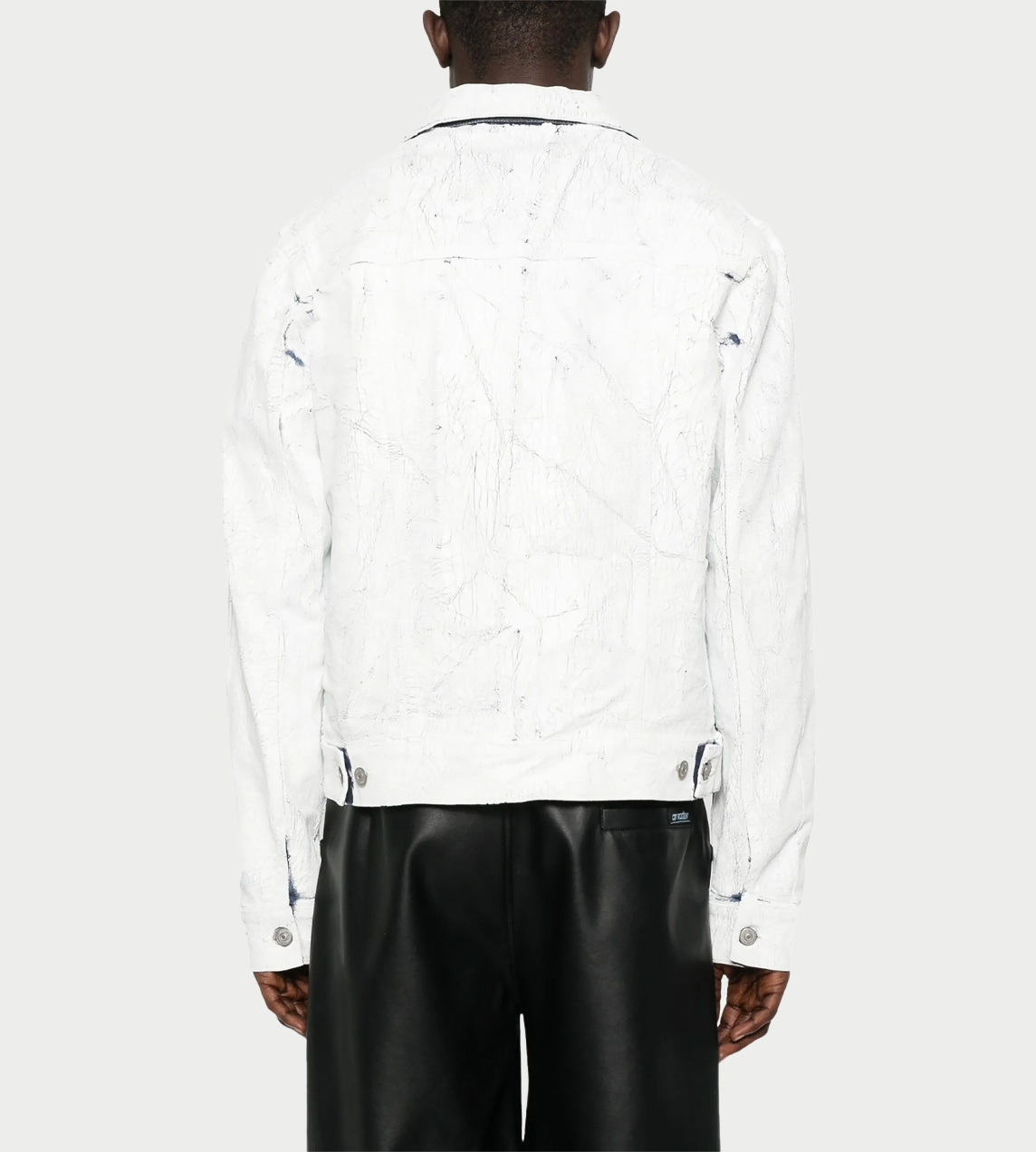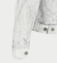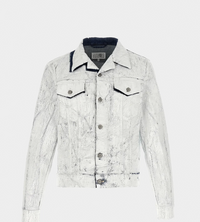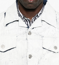 Cotton denim jacket with craqulé effect paint print, front button closure, pockets, long cuffed sleeves. Printing made by hand, minimal differences in printing from end to end are to be considered normal.