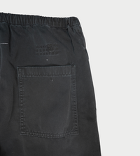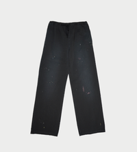 Cotton gabardine trousers in black color. Paint splatter and subtle distressing throughout. Elastic waistband with drawstring. Three-pocket styling. Zip fly. Twisted out seams. White stitching at the back.