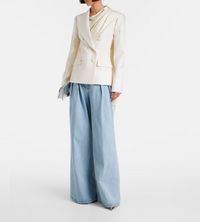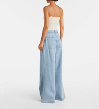 This light blue denim pants is wide-leg design. Crafted from denim canvas, it features a high waist with belt loops and a signature button for a feminine yet sculptural silhouette.