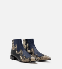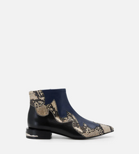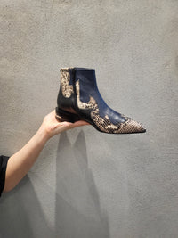 Zig zag patchwork, zip closure ankle boot in black, blue and printed leather. "Western" detail metal plate at heel.
