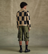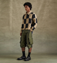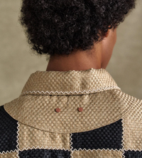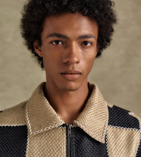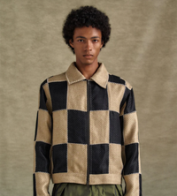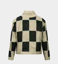 Oversized silhouette. Patchwork fabric. Zip-up jacket design with patchwork embroidery stitching.