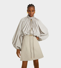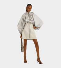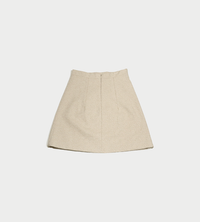 Organic cotton jacquard skirt. Seasonal Medallion pattern featuring the Patou lettering logo and JP monogram all over. Short length. A-line construction. Gold-tone Patou-engraved medallion ornament at the front. Darts at the front and back. Zip fastening at the back.