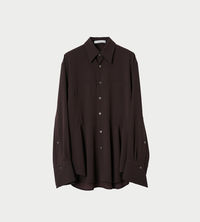 The regular-collar shirt is designed with a slim, darted bodice and a flared hem with paneling. The sharp tailoring of the bodice contrasted with the voluminous peplum creates a striking, sculpted look.