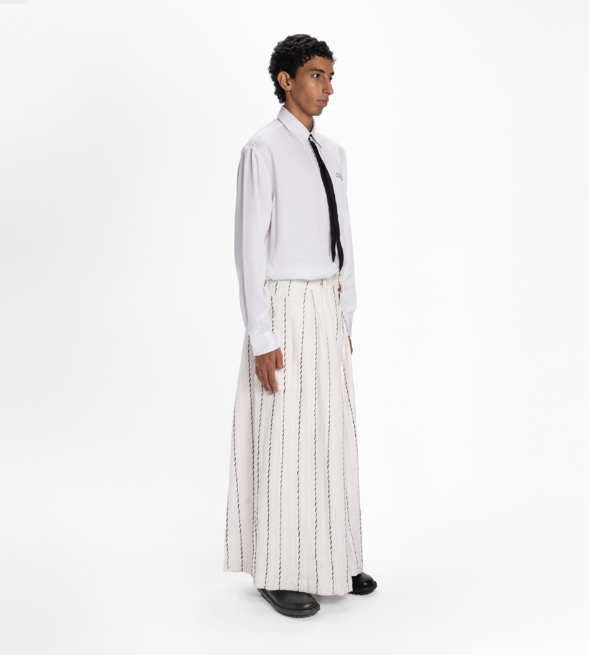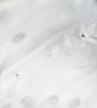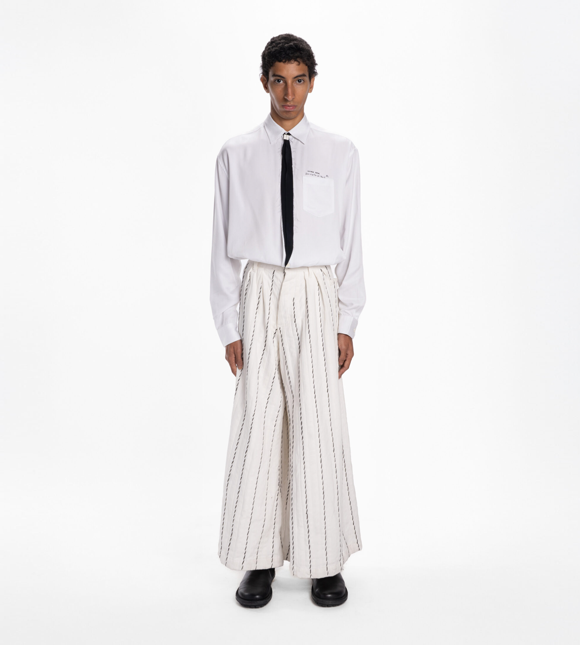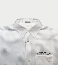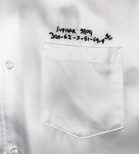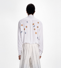 The white pharmacy shirt reimagines a wardrobe staple through subtle graphic intervention. Constructed from crisp white cotton, the shirt features a loose, relaxed silhouette with a structured collar, button front, and barrel cuffs. Small embroidered pharmacy pills labels sit at the the back of the shirt.