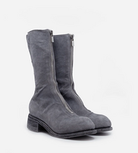 Calf height, zip front suede PL9 boot with stacked leather heel and leather sole.