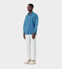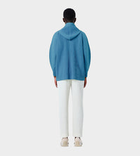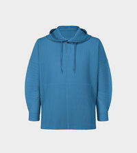 Pleated long sleeve top with hood. Centered kangaroo pockets for hands, and drawstring at collar for hood.