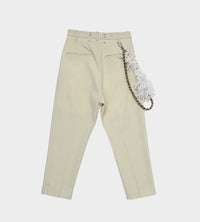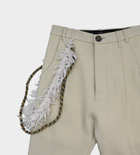 Wool gabardine 1 pleat pant with tapered leg, and slightly dropped crotch. Features removable yarn and string wallet chain.