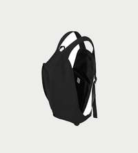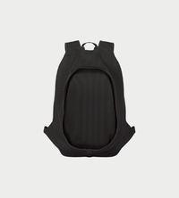 This backpack features a rounded form and is designed with functionality, including a separate front pocket, a laptop sleeve, and a bottle holder. The shoulder straps are pleated as a single piece, giving it a minimalist look and a comfortable fit.