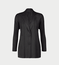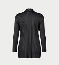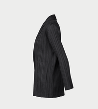 This buttoned, collared jacket is made from thick pleated material. It has pockets on both sides.