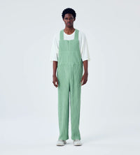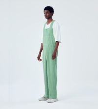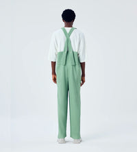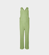 Garment-pleated overalls in light green color. Criss-crossing shoulder straps with button fastening. Straight-leg. Two-pocket styling.