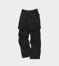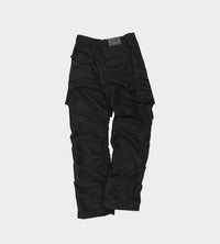 Pocket Bag Cargo Pants. Long Length with a Wide Silhouette. 3D Cargo Pocket Design with Zipper + Snap Closures. Tuck and Shirring Details, Adjustable Hem with Drawstrings. ADSB Logo Hardware.