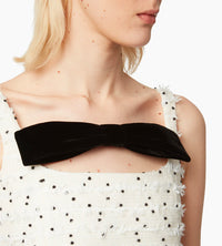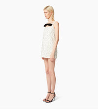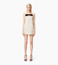 Harris Reed rethinks the mini dress in cream tweed with polka dots, enhanced by a square neckline and a contrasting bow, a symbol of the Maison Nina Ricci, on the chest.