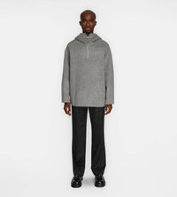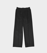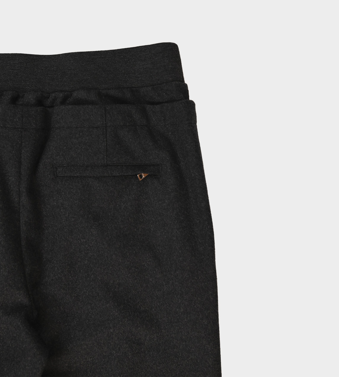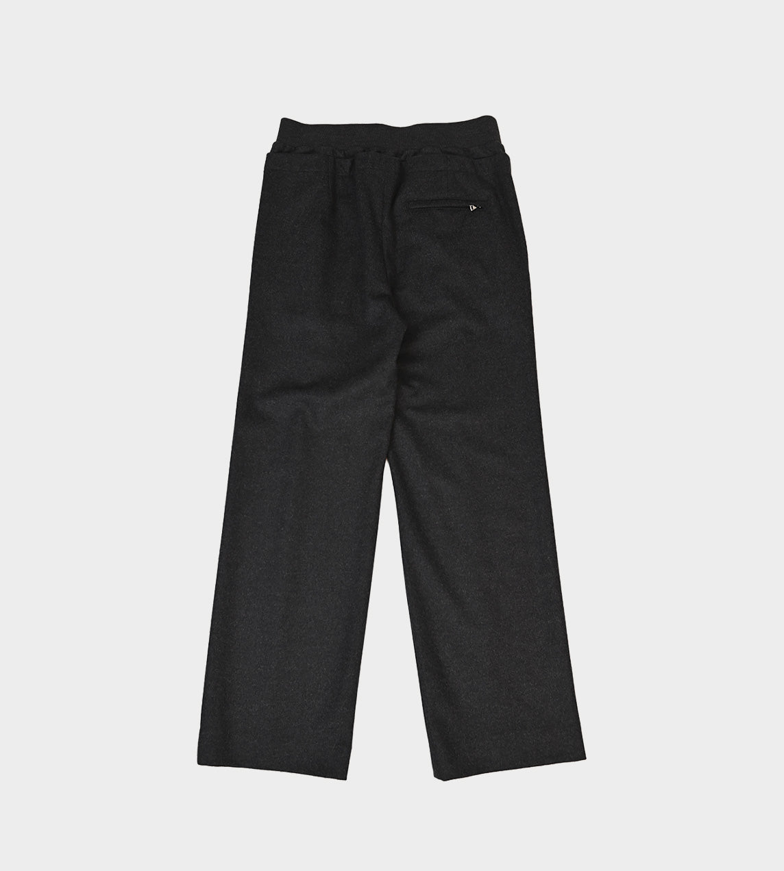 Cashmere blend flannel straight leg pants with pressed crease, Elastic waist band with dropped panel. 2 trouser pockets, and 1 back pocket with zipper closure.