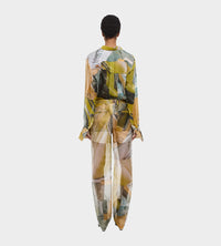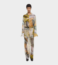 Tailored car trouser in silk organza. This relaxed fit trouser is printed with a custom car graphic developed by our design studio. Partially lined, with flat front, and zip fly/hook-and-eye closure.