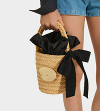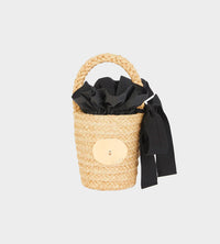 Vanilla raffia bucket bag. Braided top handle. Gold-coloured embellishment inspired by the "Bocca della Verità" with engraved Patou. Fabric lining with ruffle and bow.