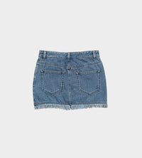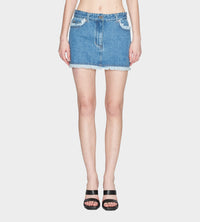 Basic denim mini skirt with frayed edge detail, and 5 pocket styling.