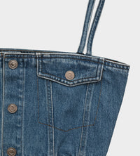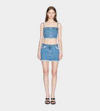 Cropped denim, button front top with frayed edge detail. 2 pocket flaps for design only and are not functional.