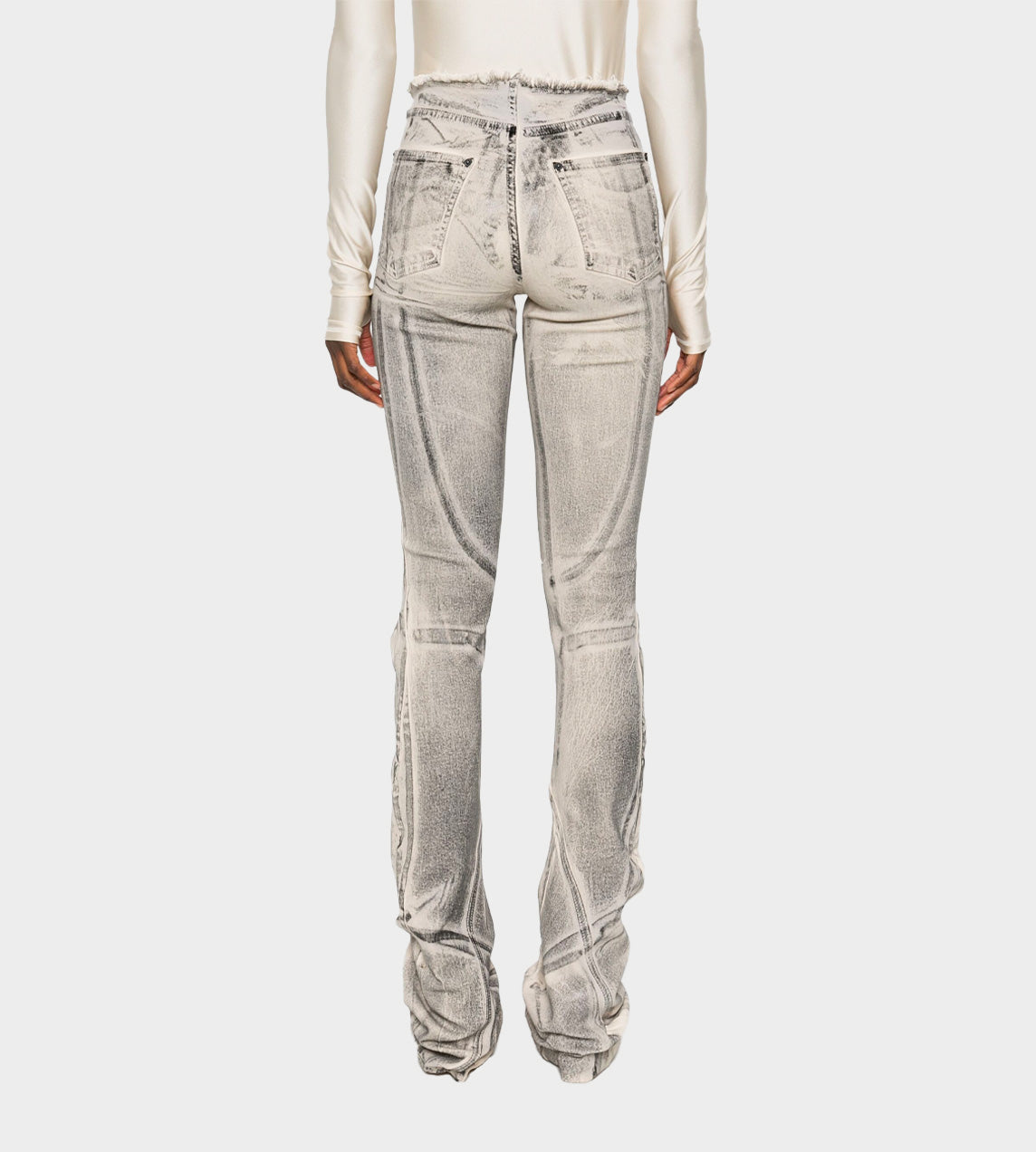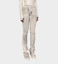 OTTOLINGER jeans in ecru & black, paneled cotton-blend construction, fading & staining, raw hems, cut-off waistband, front concealed zip fly closure, inset pockets, coin pocket, flared leg, slim fit.