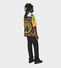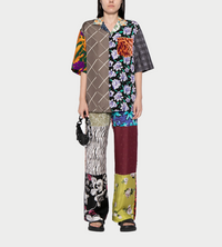 Pushing the boundaries between loungewear and casualwear, these unique silk shirts are regenerated from 6 upcycled silk scarves. In an edgy patchwork design, they feature open spread collar, button front closure, and short sleeve. A logo embroidery in a contrasting hue reinforces the branded look. **Due to the pants being made of regenerated scarves, each one is different and unique. Please contact the store directly for pictures of the size you are looking for.