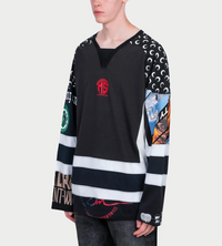 Regenerated long-sleeve hockey-style T-shirt crafted in soft jersey, featuring a bold graphic print across the chest. Designed with a relaxed silhouette, dropped shoulders, and ribbed neckline and cuffs for a structured finish.