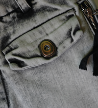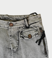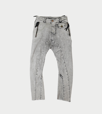Masnada classic relax fit denim in bleached white/grey color. Scar stitching, belt loops, hand-bleached garment treats for unique aspect.