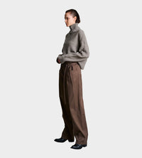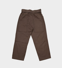These pants feature large pockets and a cord belt with a ring. These work inspired pants feature a stitched center crease, with a wide leg.