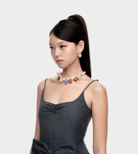 Pair of rubber band earring in yellow and light blue color. Gemstone and pearl detail.