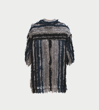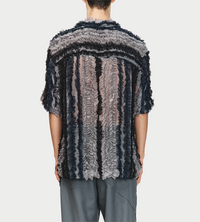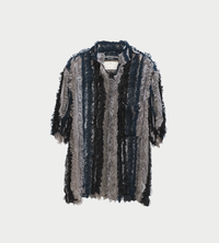 Single layered oversized button up short sleeve shirt with ruffled chiffon details. Oversize armholes and dropped shoulders enable dynamic movement.