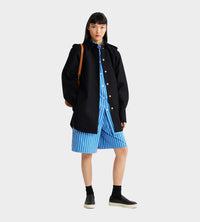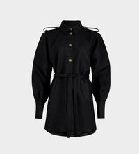 Black sustainable wool blend flannel dress. Short length. Straight silhouette. Shirt collar. Gold-tone JP-engraved buttons. Volume raglan sleeves. Buttoned cuffs. Removable self-tie belt at the waist. Embroidered Patou and JP at the front. Lined.