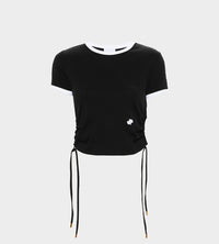 Black organic cotton t-shirt. Ribbed fabric. Crewneck. Contrast collar and cuffs. Side cut-outs with adjustable drawstring. Contrast JP embroidery at the front.