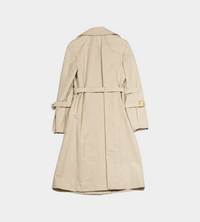 Organic cotton jacquard trench coat. Seasonal Medallion pattern featuring the Patou lettering logo and JP monogram all over. Tailored single-breasted silhouette. Knee length. Notch lapels. Storm flap at the front. Gold-tone Patou-engraved buttons at the front. Adjustable gold-tone buckle belt that sits at the waist. Side seam patch pockets at the front. Belted cuffs. Signature Patou label on the left arm. Signature curved seam at the back. Single back vent with gold-tone Patou-engraved button.