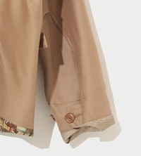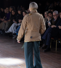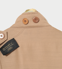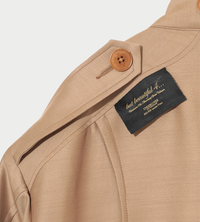 Silk-blend wool jacket featuring subtle silk accents and a structured yet fluid silhouette. Detailed with 3D pockets and flap pockets at the front, finished with a signature back tag. Adjustable drawstring waist and cotton lining provide comfort and versatility for layering.