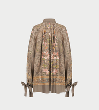 Crafted from lightweight silk with a subtle print, this blouse features a relaxed silhouette and a tie-front detail. The green tone enhances its refined drape, making it a versatile piece for both casual and elevated styling.