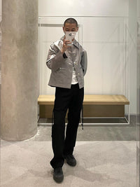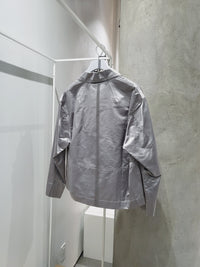 Shiny silver cotton/viscose blend jacket with multiple pockets, and cuff with slit meant to be turned up.