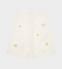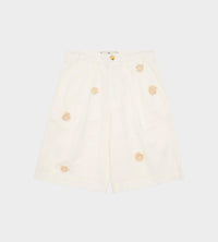 Plain-woven polyester- and recycled polyester-blend shorts. Floral crochet appliqués throughout. Four pocket styling, with button fly closure, and pleats at front.