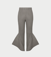These pants feature a powerful silhouette reminiscent of the towering buildings in a city, achieved through adding folds at the hem. They have pockets on both sides.