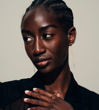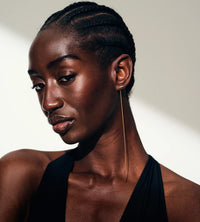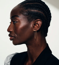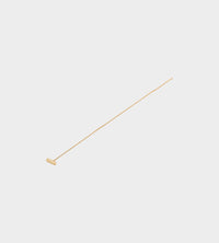 Simple, clean and modern this 140mm long, thin gold chain is meant to be threaded through a piercing with a rectangular stopper at one end.