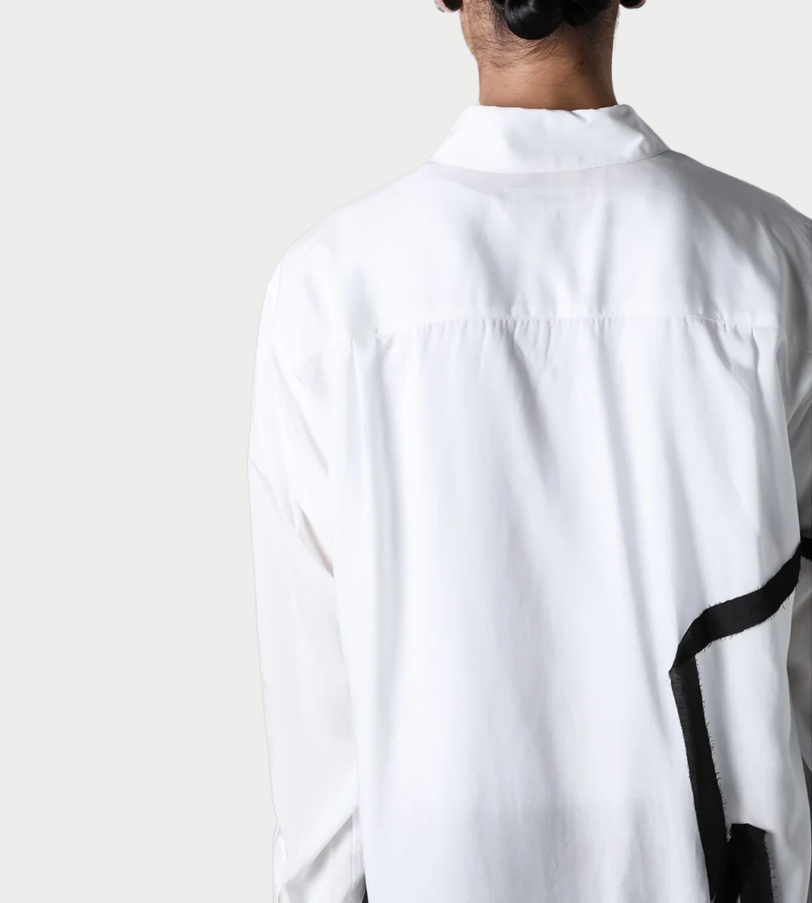 Gather ribbon relaxed-fit shirt in white, forward-point collar, concealed front button closure, smocked yoke seam detailing, long sleeves, buttoned cuffs, curved hem, tonal stitching, black contrasted stripes detailing.