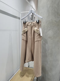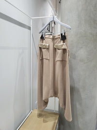Heavy gauge felted wool sarouel trousers with asymmetric flap patch pockets on the front and back. Silver tone hardware, and slash details along the seams of the legs.