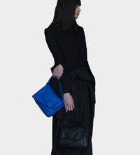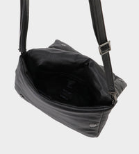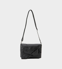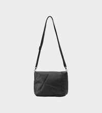 This small crossbody bag is stuffed of cotton wrapped leather with irregular stitches. The flap can be opened and closed with a magnet in the center, and the body is even simpler. It can also be used as a clutch bag by removing the shoulder strap.