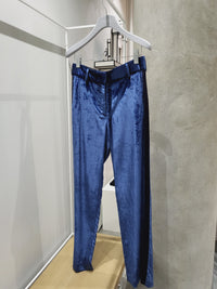 Mid-rise liquid velvet trousers with black grosgrain ribbon tuxedo stripe. 2 trouser pockets at waist, with 1 back pocket that can be opened up.