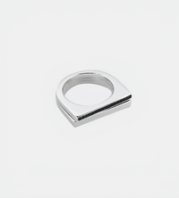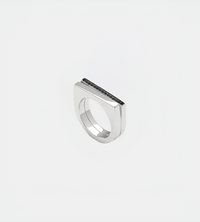 A minimal and slim band ring with a modern graphical take, inspired by the steep and iconic mountains in the Western parts of Norway. Made in recycled 925 sterling silver, plated with white rhodium to strengthen the surface and prevent tarnishing. The top part comes with handset black spinel. **The top width of the ring and number of black spinel depends on the ring size due to the straight fitted sides of the ring shank.