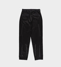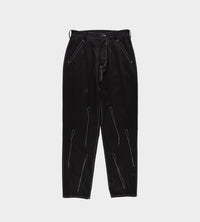 Black cotton twill straight leg pants with contrast white top stitching. Slash pockets at front for hands, and stitched pleats on legs for a tapered fit.
