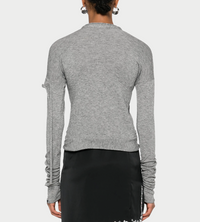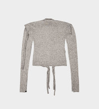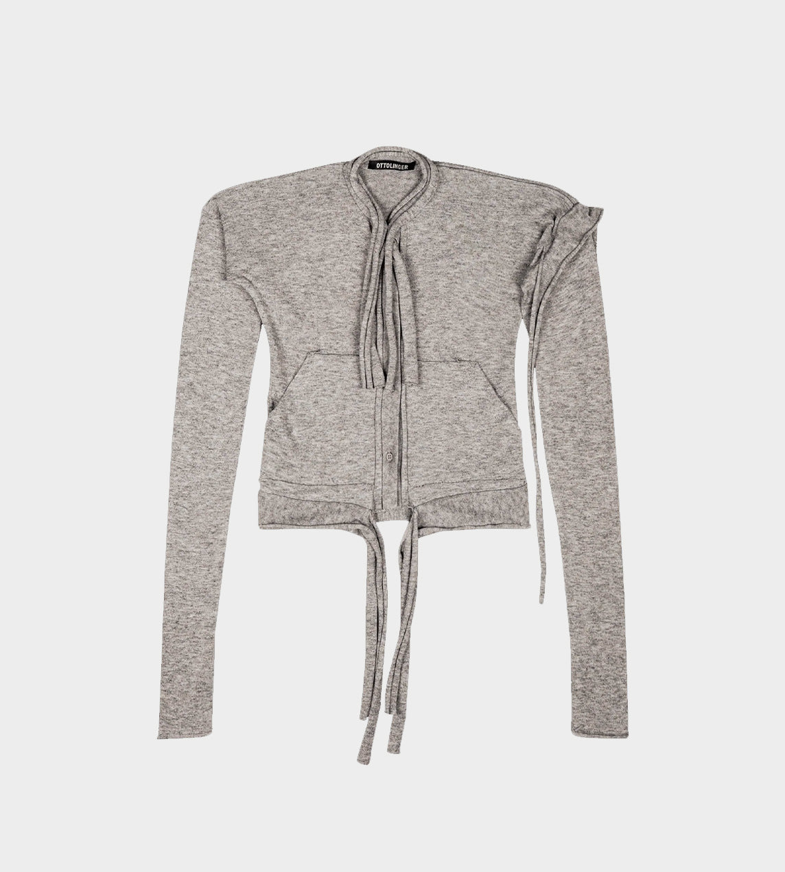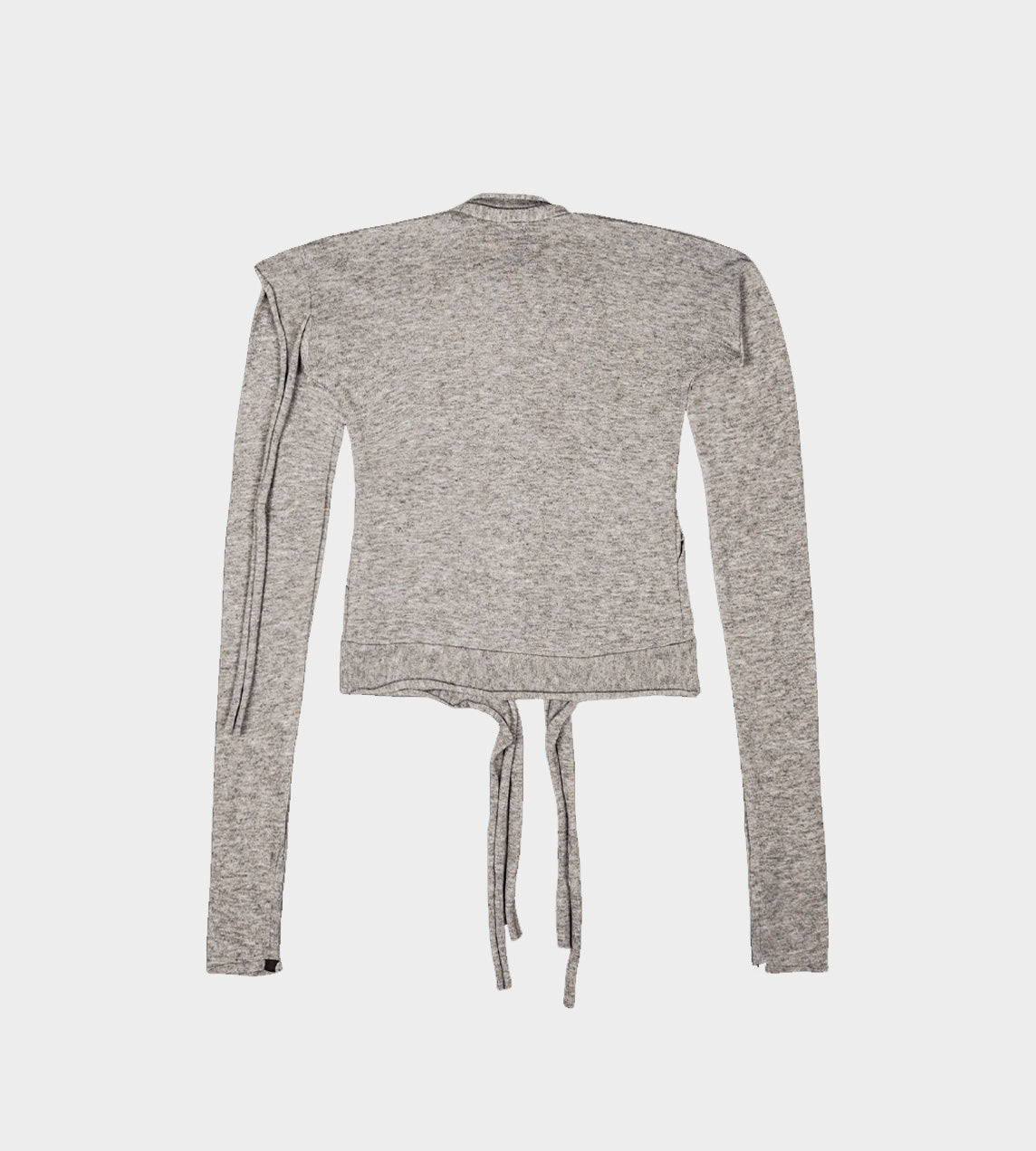 Strap and wrap detailed knit cardigan. Extra long arms. Asymmetrical construction.
