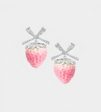 Bow-knot earrings in gold-tone brass, featuring enamel strawberry motifs and crystal-set details. Fixed stud posts and butterfly backs for secure wear.