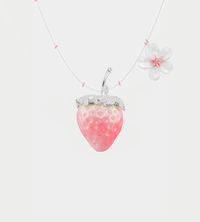 Beaded-chain flower necklace with strawberry motif pendant in silver-tone alloy, enamel details and delicate crystal accents. Adjustable chain length for custom wear.