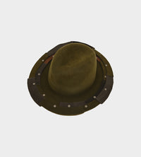 Thicker rabbit felt fedora hat with brown and green toned pieced brim with brass tone studs.