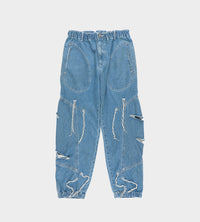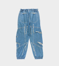 Elastic waistband, jogger-style jeans with circular pockets at front, and slashes on the legs. Top stitching details with hanging thread detail. 2 circular back pockets. All pockets and slashes in the denim are unfinished with a raw edge, some unravelling will occur.