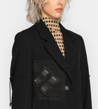 Half lined jacket in a thick wool gabardine. Featuring a notch lapel collar and a geometric mirror applique on the front. Two button closure with welt pockets at waist. Adjustable rope cinching on sleeves, non-functional buttons at cuffs and back vent for ease of movement.